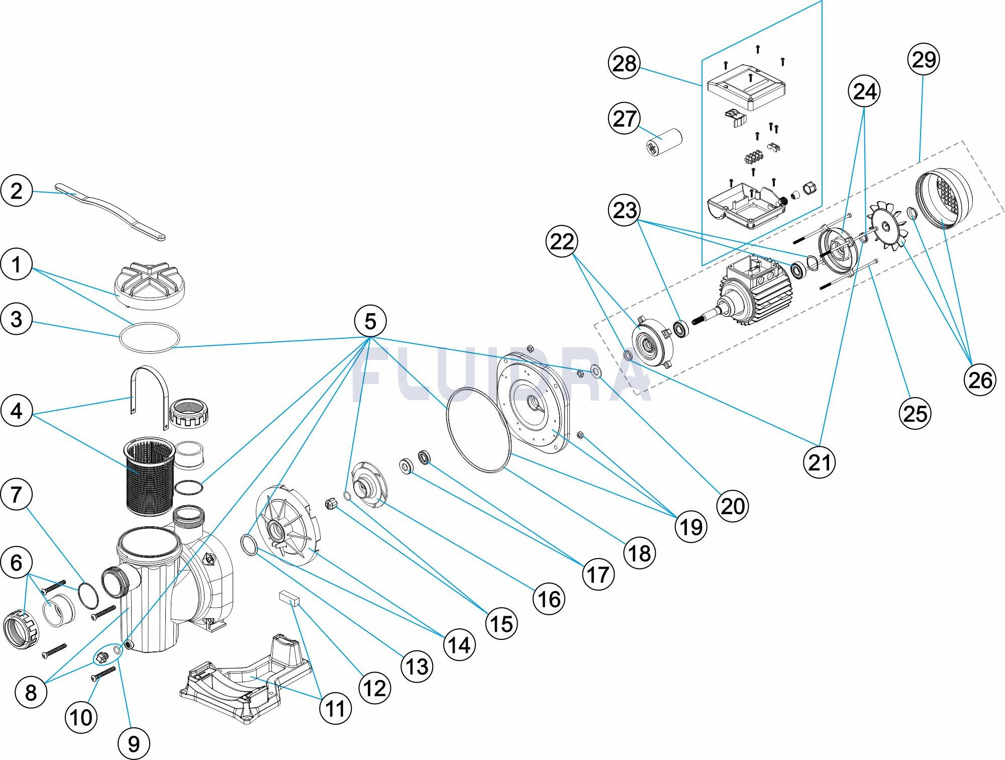 Clasa de protectie a motorului este IP55 cu parti ce intra in contact cu apa din inox AISI316.